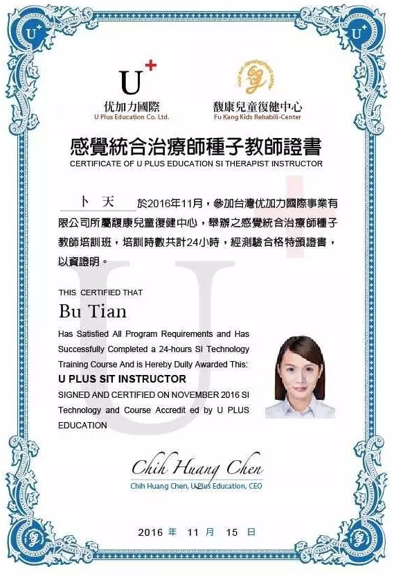 培训人员需接受考核,考核通过可获得由优加力国际所属馥康儿童复健中心颁发的“感觉统合治疗师种子教师证书”