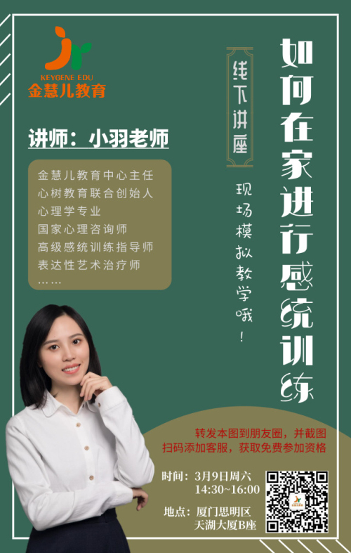 本次讲座,金慧儿教育中心主任小羽老师将为家长指导居家感统游戏具体如何开展,及其中的注意事项等,并会现场模拟手把手教学,让家长更有方向与自信来开展家庭训练。