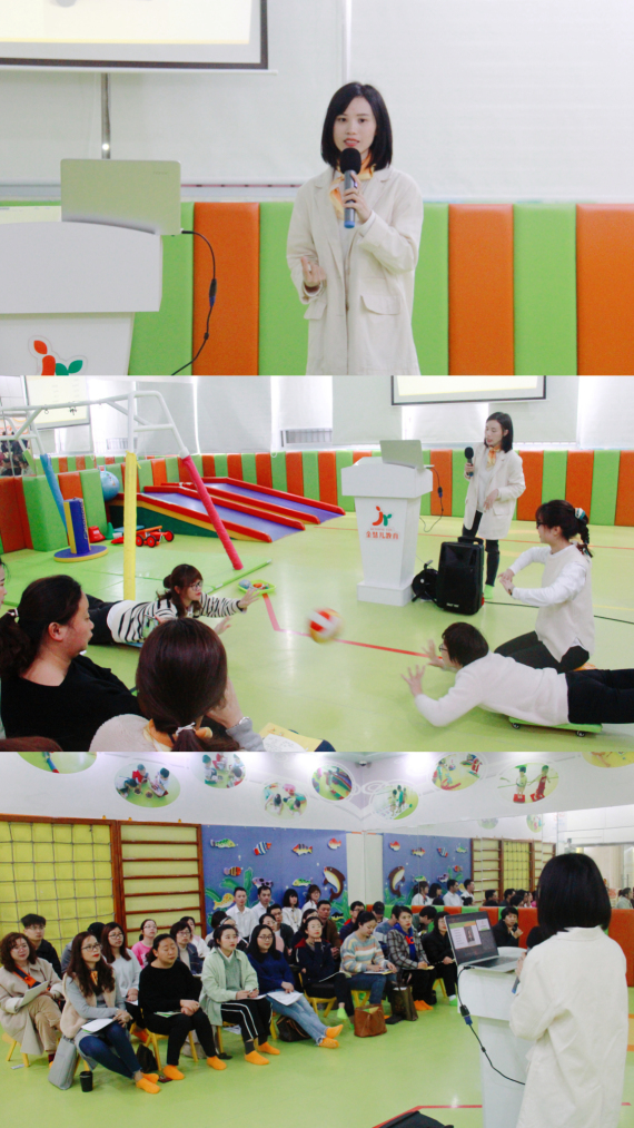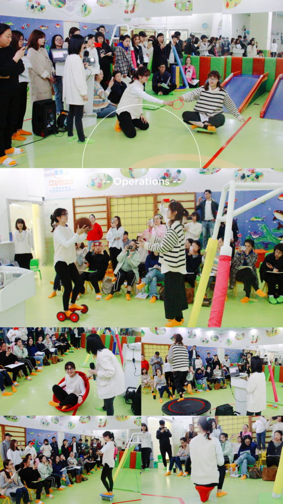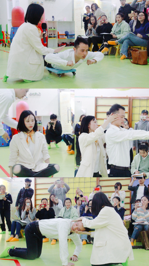 本次培训第四天由金慧儿教育中心主任、心树教育联合创始人黄羽老师带领大家开展实操培训,黄羽老师讲解示范了感觉统合评估体系、个案分析等要点精髓,并示范感觉处理中经典教具的操作及创意教学指导。