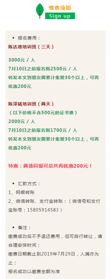 5.若报名陈达德培训班需提交两寸免冠白底彩色证件照1张;若报名陈泽铭教授的培训并要证书者需提供更多个人资料,提前联系潘老师。