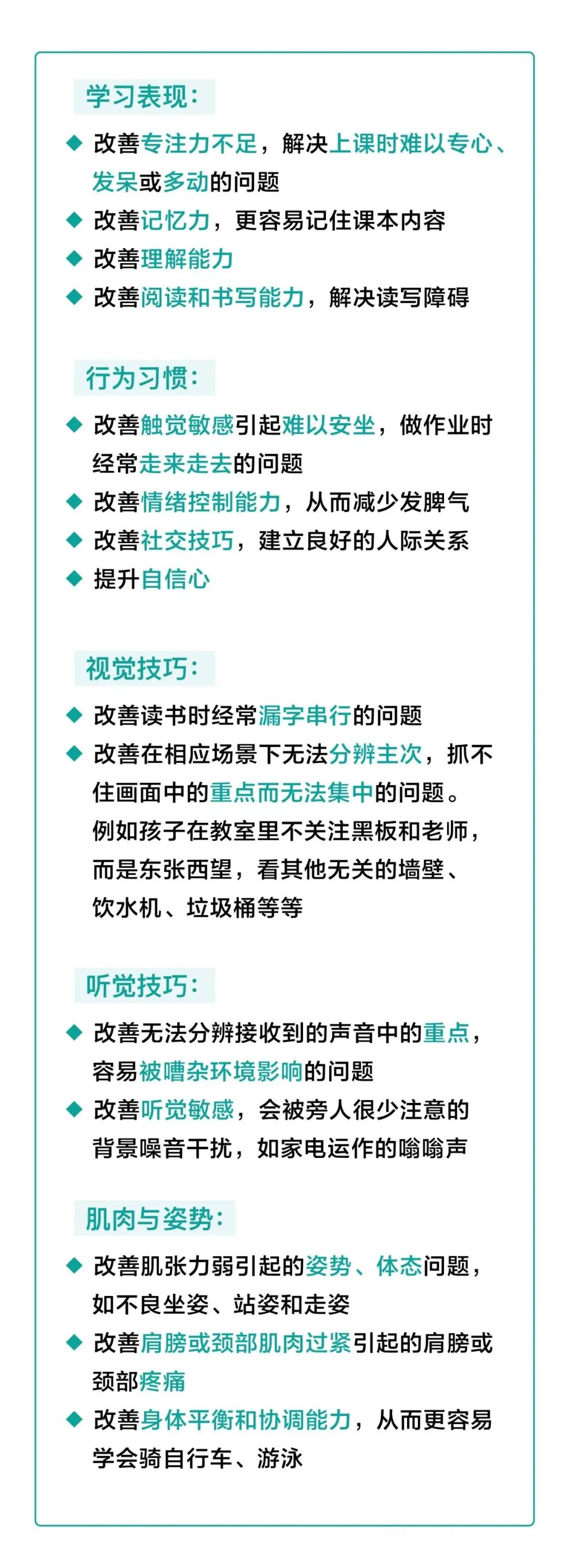要有效地运用整个大脑,大脑的不同部分就必须得到开发和彼此连接起来,婴儿出生后自发性的身体律动是其大小肌肉、情绪管理、语言能力、视觉及大脑发展的重要基石。透过进行“布隆贝格韵律运动训练”,孩子大脑可以得到适当的感官刺激,协助大脑的神经细胞增生,开发出新的神经细胞分支,使大脑不同部分得以紧密连接,从而改善以下问题: