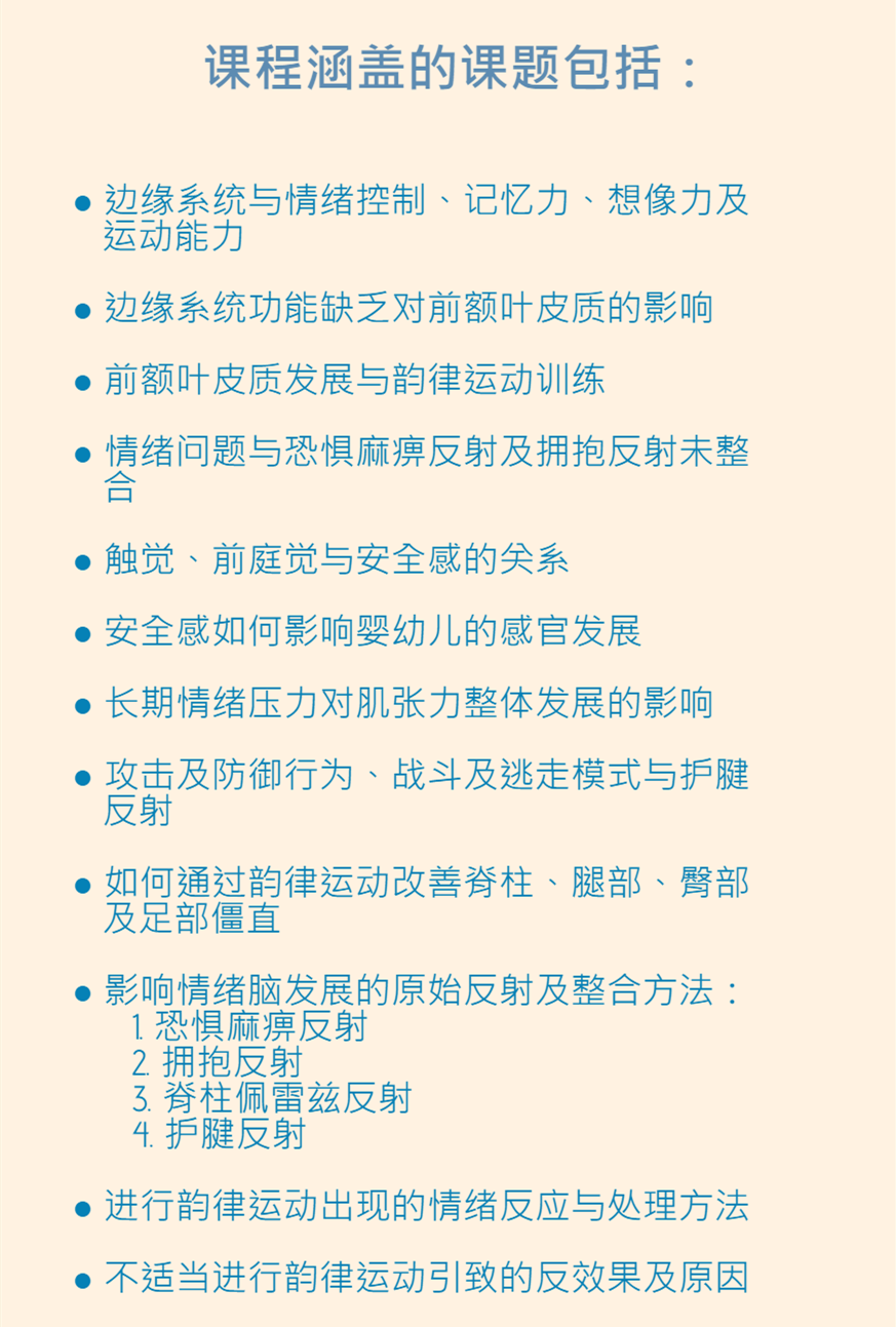 本课程讲解及讨论以下课题:情绪发展与孩子整体表现的关系、不同的感官刺激(如前庭觉及触觉)如何引导孩子的情绪发展、情绪如何影响肌肉表现、如何透过“布隆贝格韵律运动训练”提升自信心、加强抗压力、舒缓紧张情绪、建立安全感、放松过紧肌肉及增强前额叶的决策和批判思考能力,从而提升学习表现和生活质量。