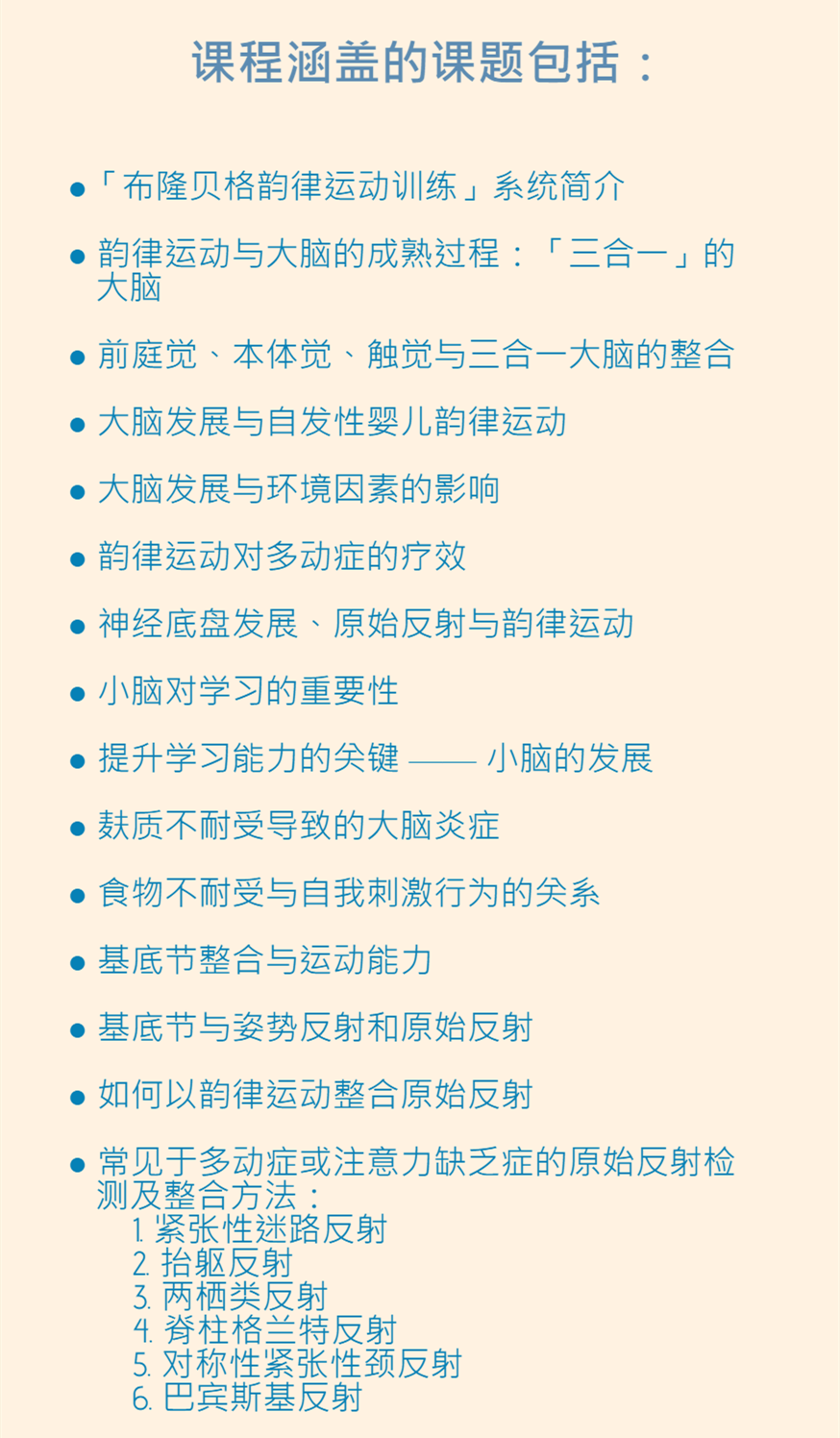 本课程主要讲解BRMT的概念、大脑及身体发展过程、如何以BRMT让脑部各部分得以成熟发展,从而改善专注力、大小肌肉张力及协调能力、手眼协调及身体姿势等问题,以提升学习表现及运动能力。课程亦会讲述自闭症及多动症的成因,以及电磁辐射和食物营养等环境因素如何影响孩子的原始反射整合过程。