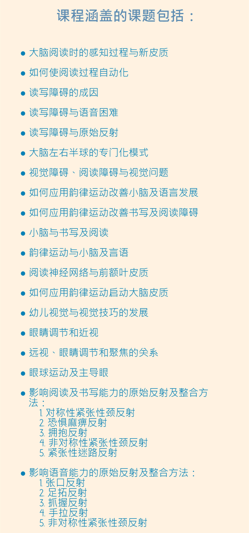 本课程将讲解视觉功能及技巧的发展、从原始反射的角度探讨与视觉问题有关的情况,如近视、远视和读写障碍的形成原因,如何透过韵律运动训练改善书写与阅读障碍,提升视觉技巧:变焦能力(抄写黑板能力)、聚焦能力、双眼追视能力,提升学习表现。
