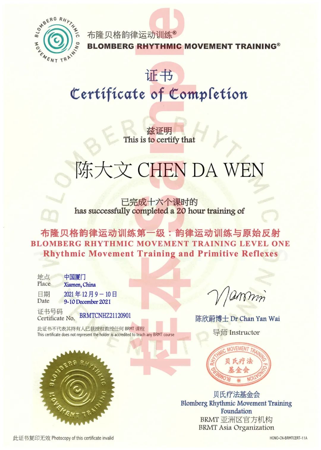 陈欣蔚博士跟随布隆贝格医生学习BRMT多年,负责所有BRMT于亚洲的事务,是香港及祖国大陆唯一由布隆贝格医生认可的BRMT机构。陈博士集合过去10多年的经验以及专业知识,为本地及来自祖国大陆、澳洲、马来西亚及新加坡等地方的学生(包括家长、治疗师及教育工作者等)提供一系列BRMT成人及儿童课程。所教授的学生至今已超过一千名。