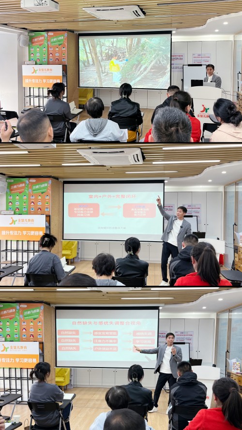 研修班由大树老师率先开讲。他从一个核心观点切入——很多孩子的注意力、情绪甚至近视问题,根源在于"自然缺失"。大自然才是没有天花板的感统训练场,真实地形能让室内训练的成果真正迁移,孩子开心、家长不焦虑、老师压力也更轻。从教育价值讲到商业逻辑,大树老师同样直接:周末营做蓄水池,还能反向为室内课引流,再铺垫寒暑假营队,形成室内外双闭环。加上户外没有场地租金,轻量启动就能跑通。
