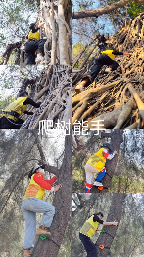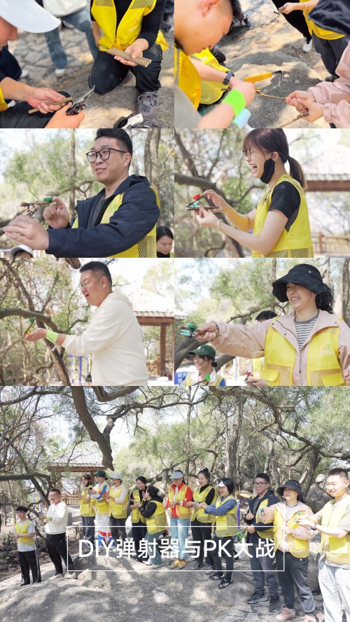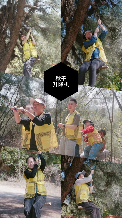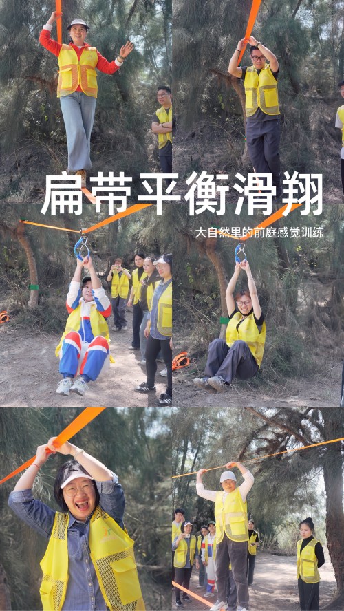 扁带平衡、滑索体验、秋千升降机、DIY弹射器PK、爬树挑战、蒙眼前行、滑草板冲刺、盲人摸树、树叶触觉辨别、磁铁吸铁砂探索、山林美食……不是观摩,是每位学员亲身上阵、逐项走通。金慧儿团队一边带体验,一边教技巧——扁带架设、安全穿戴、风险预判、带队要领——每个细节都在现场讲透、练透。